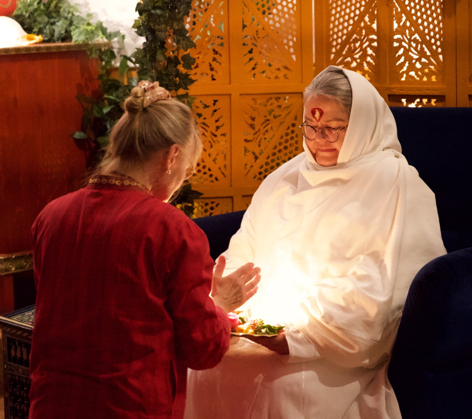 Ma arrived in the morning and stayed at Baba Mandir all day. Immediately after Ma’s arrival, Ma invited everyone to come with her and showed us that part of the ashram, which many didn’t know yet – the “Waiting Room”, the Darshan room, Ma’s “Office” and small kitchenette – all behind the blue door with a golden OM. The rooms are connected in a circle and the hallway is quite narrow, so we kept walking through in one long line – Ma among us, she went round and round several times.